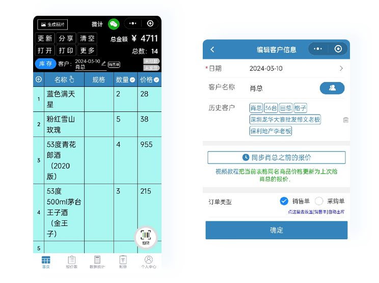 开单展示上五次单价、客户近期交易记录、开单默认客户,不怕记不住不同客户不同价格。
