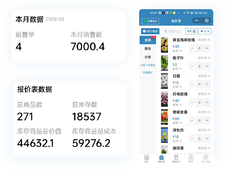 支持出库、入库、按盘点调实时更新库存等实用功能